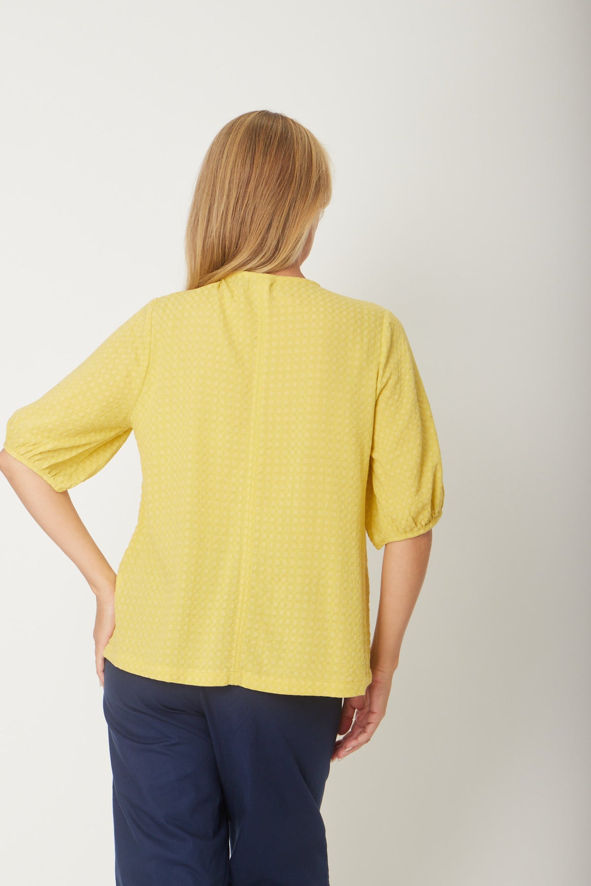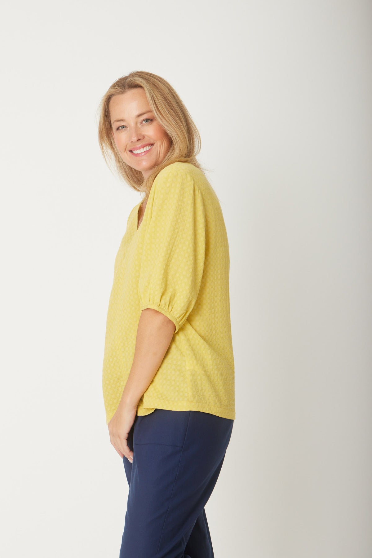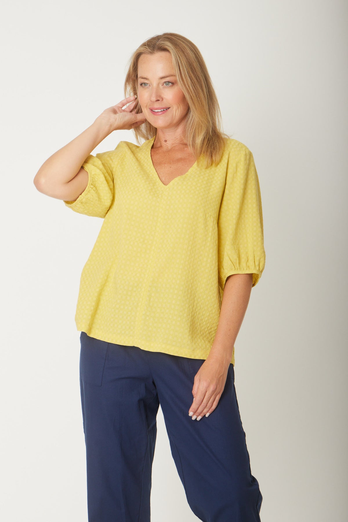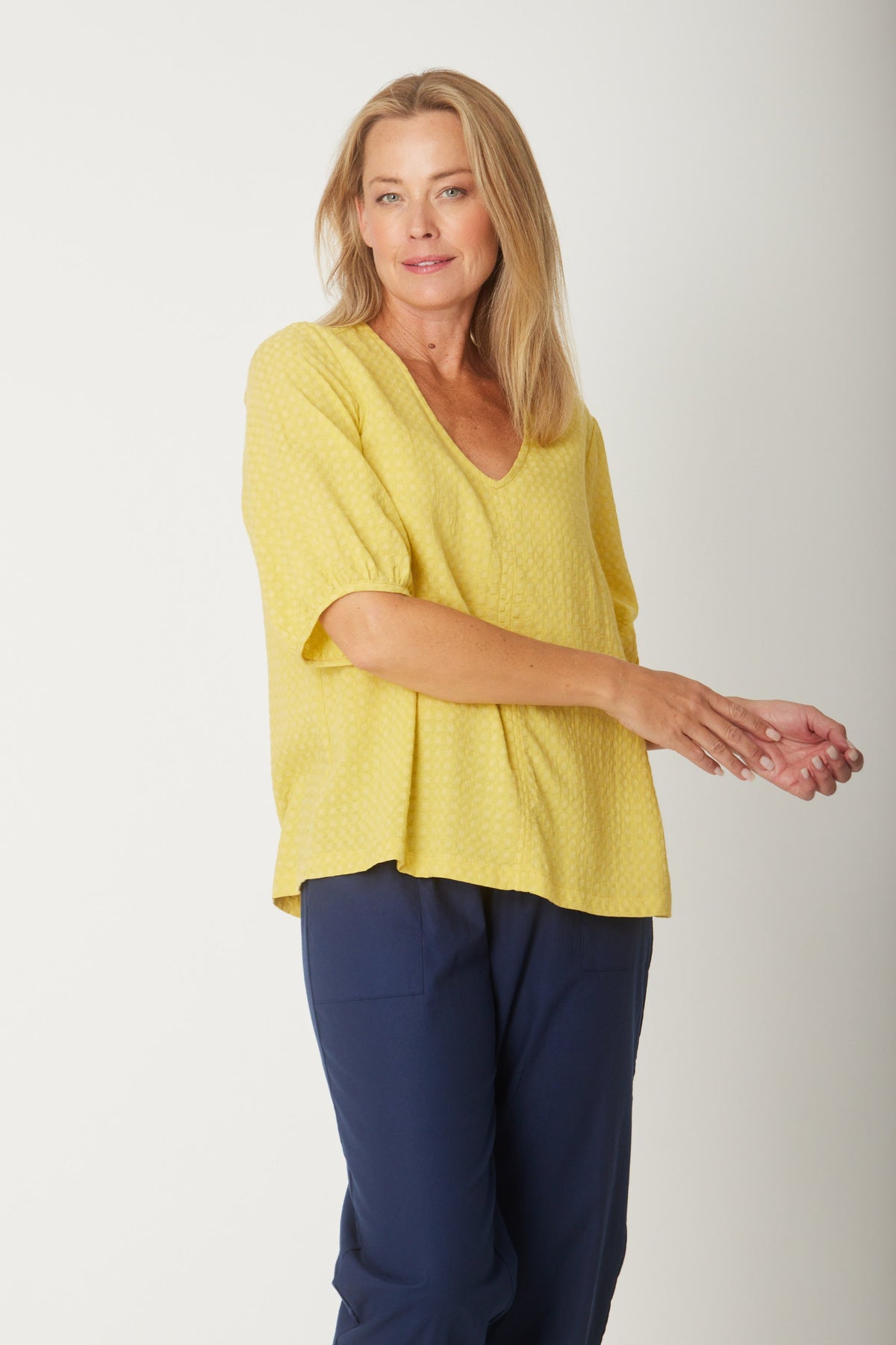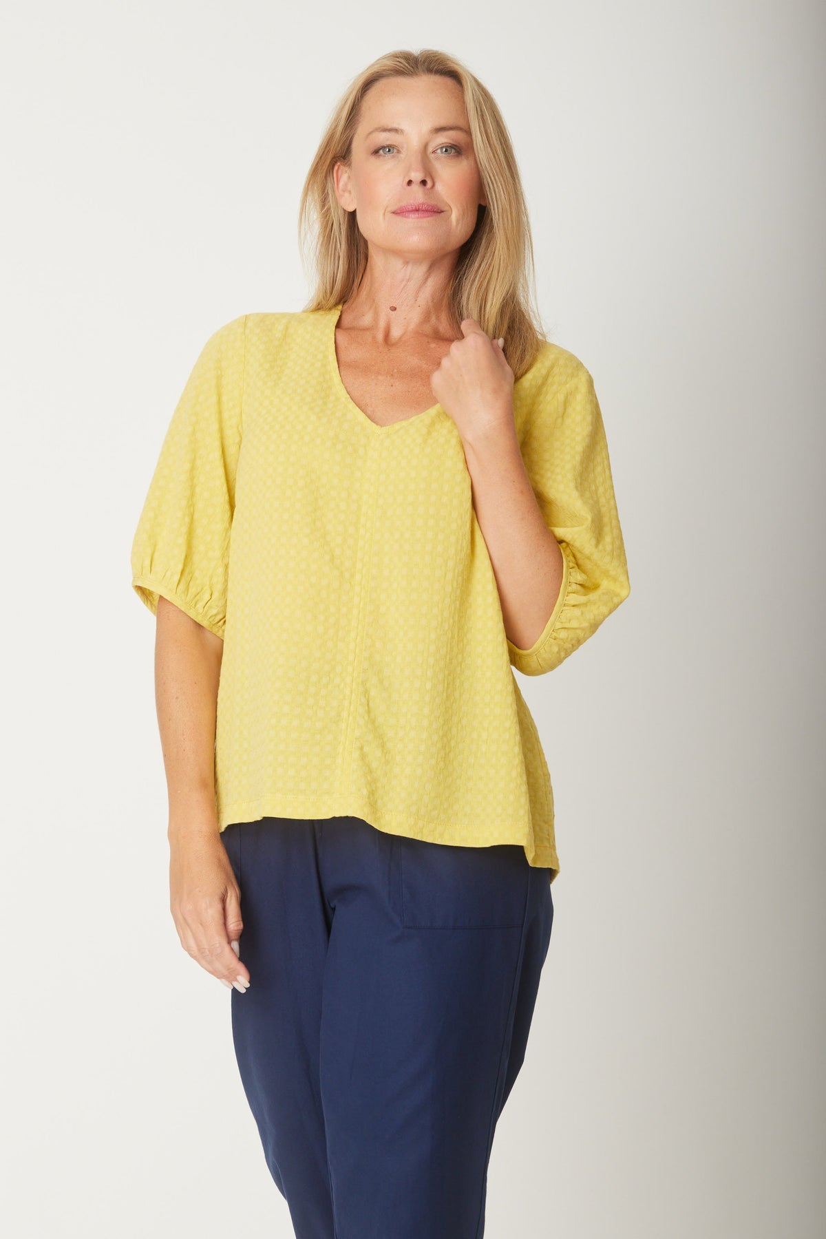 Discover effortless elegance with the Victoria Textured Top. Crafted from a luxuriously soft tonal check fabric, this piece features a flattering vee neckline and relaxed balloon sleeves that move with you. The three-quarter length sleeves strike the perfect balance between coverage and style, while the textured weave adds subtle visual interest. Soft, comfortable, and versatile—this top transitions seamlessly from casual days to dressed-up occasions.