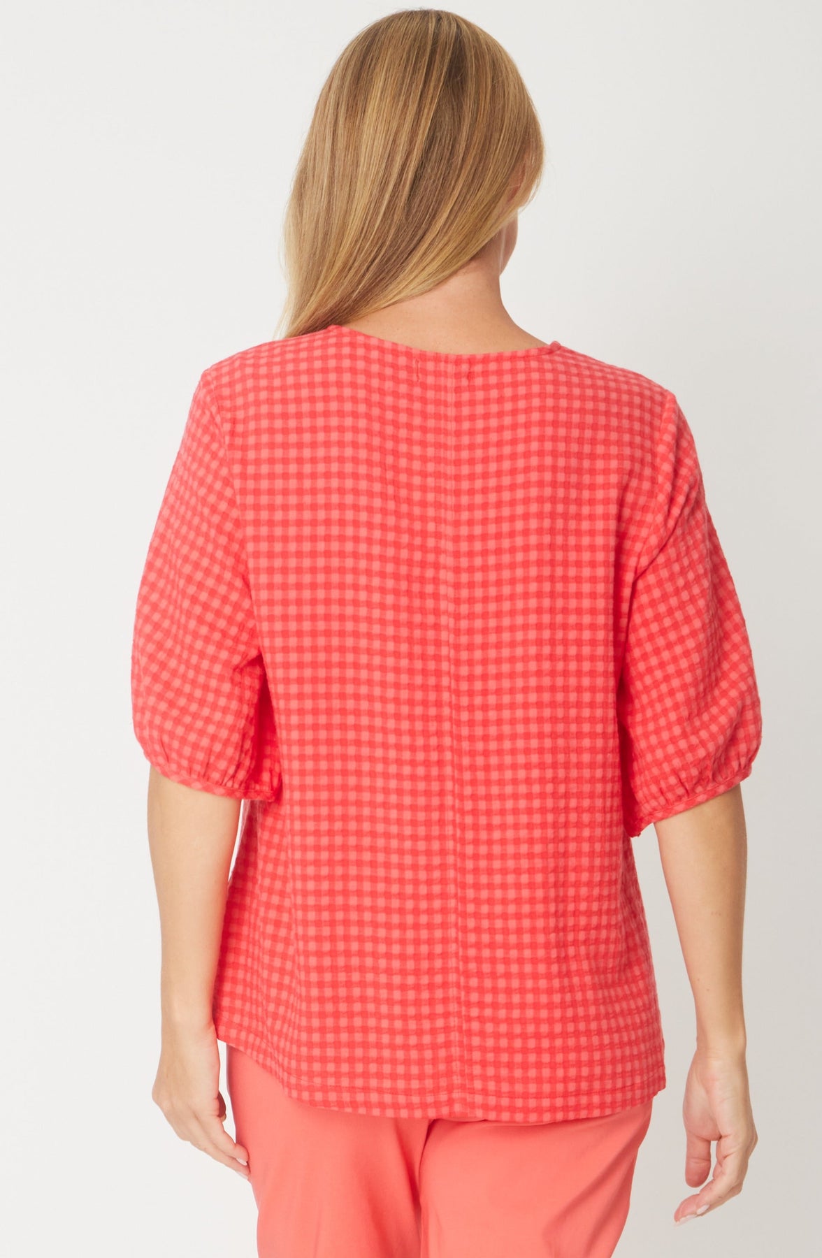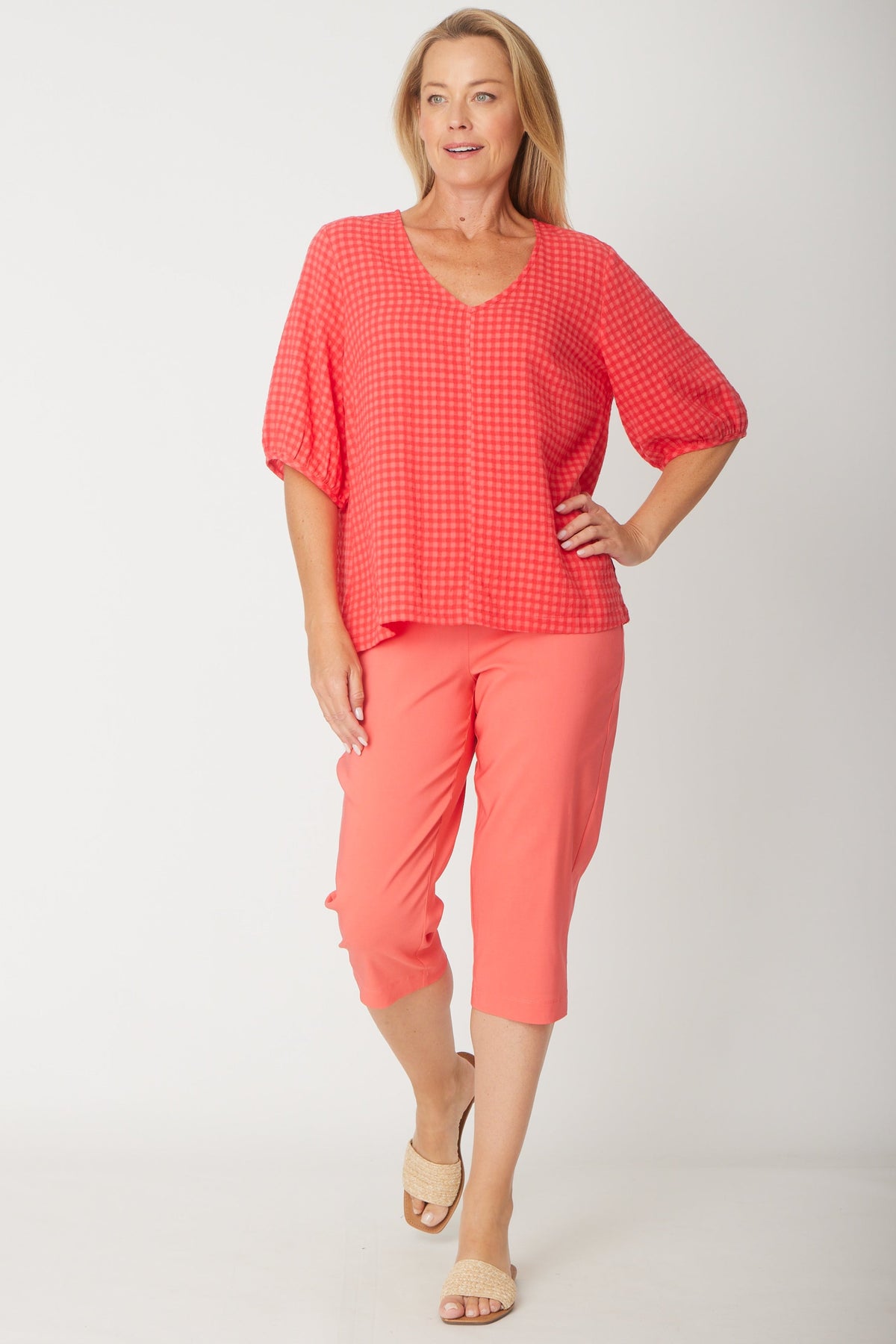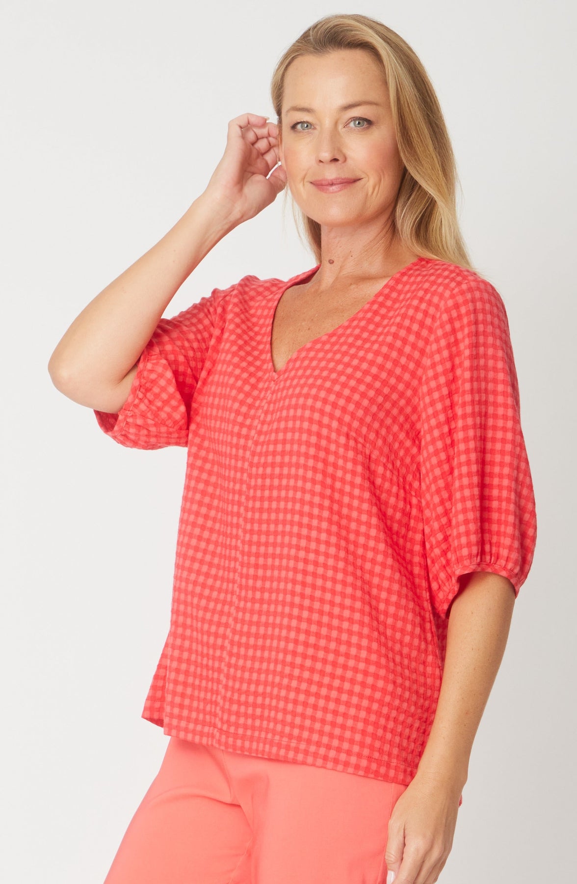 Discover effortless elegance with the Victoria Textured Top. Crafted from a luxuriously soft tonal check fabric, this piece features a flattering vee neckline and relaxed balloon sleeves that move with you. The three-quarter length sleeves strike the perfect balance between coverage and style, while the textured weave adds subtle visual interest. Soft, comfortable, and versatile—this top transitions seamlessly from casual days to dressed-up occasions.