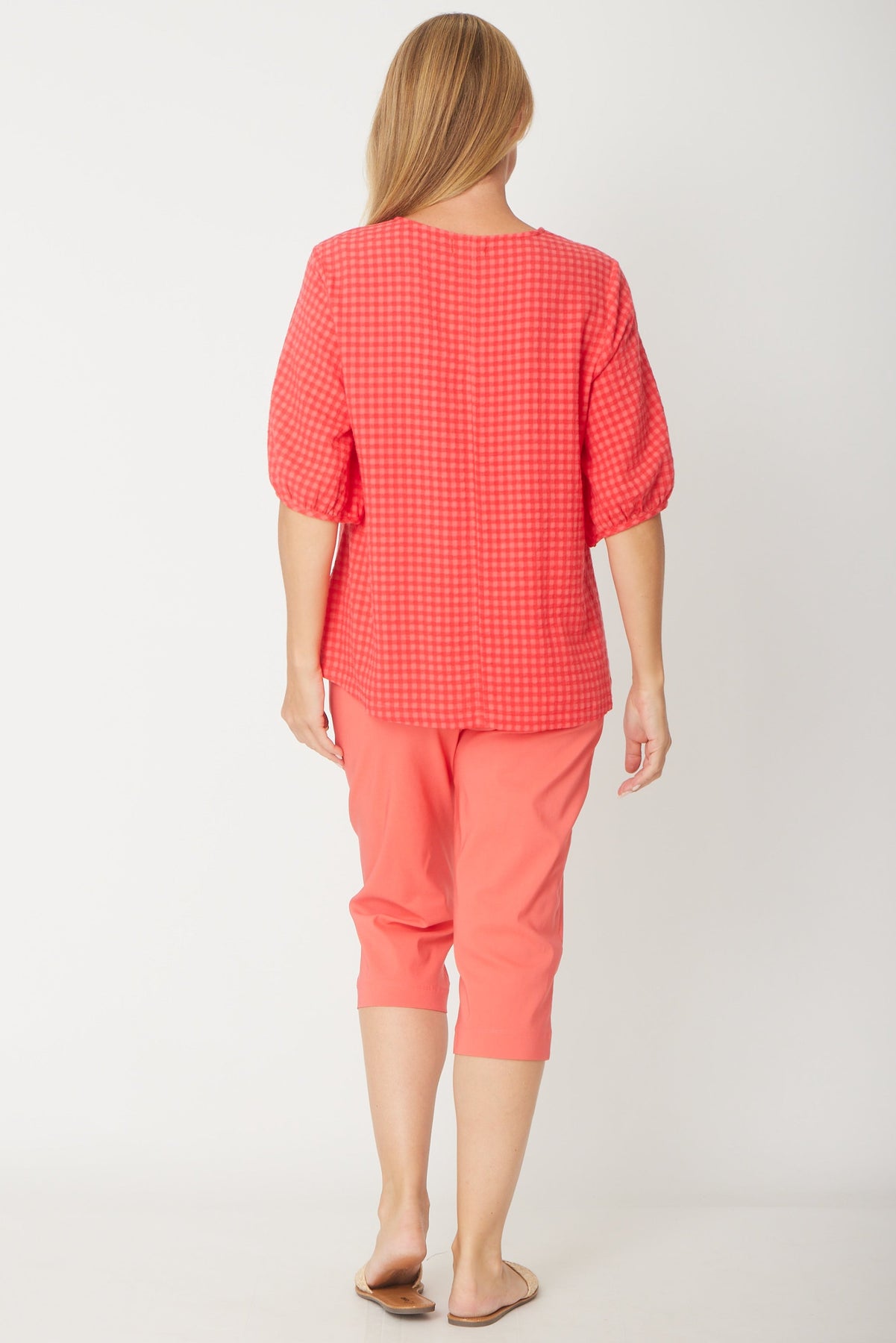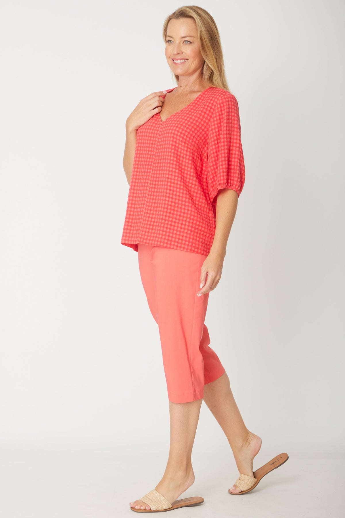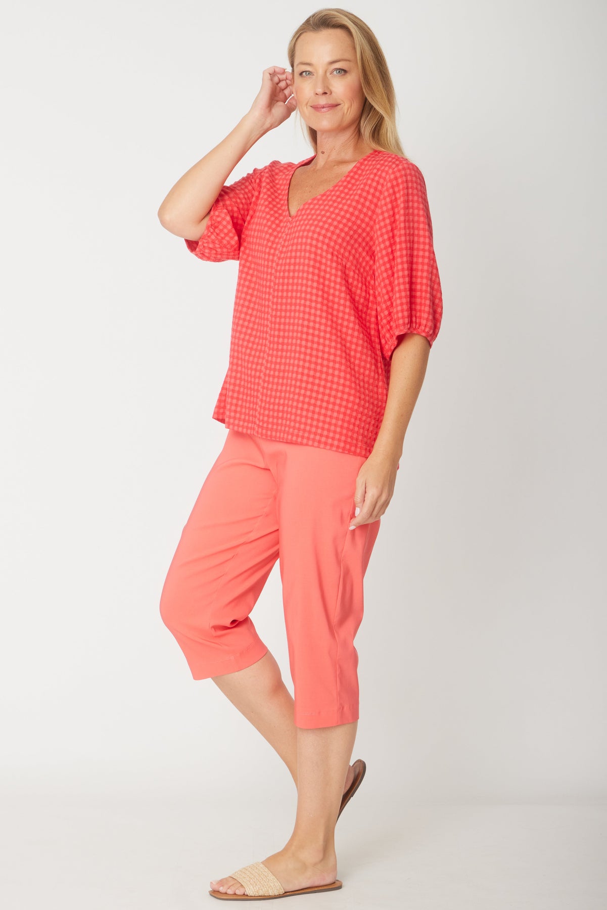 Discover effortless elegance with the Victoria Textured Top. Crafted from a luxuriously soft tonal check fabric, this piece features a flattering vee neckline and relaxed balloon sleeves that move with you. The three-quarter length sleeves strike the perfect balance between coverage and style, while the textured weave adds subtle visual interest. Soft, comfortable, and versatile—this top transitions seamlessly from casual days to dressed-up occasions.